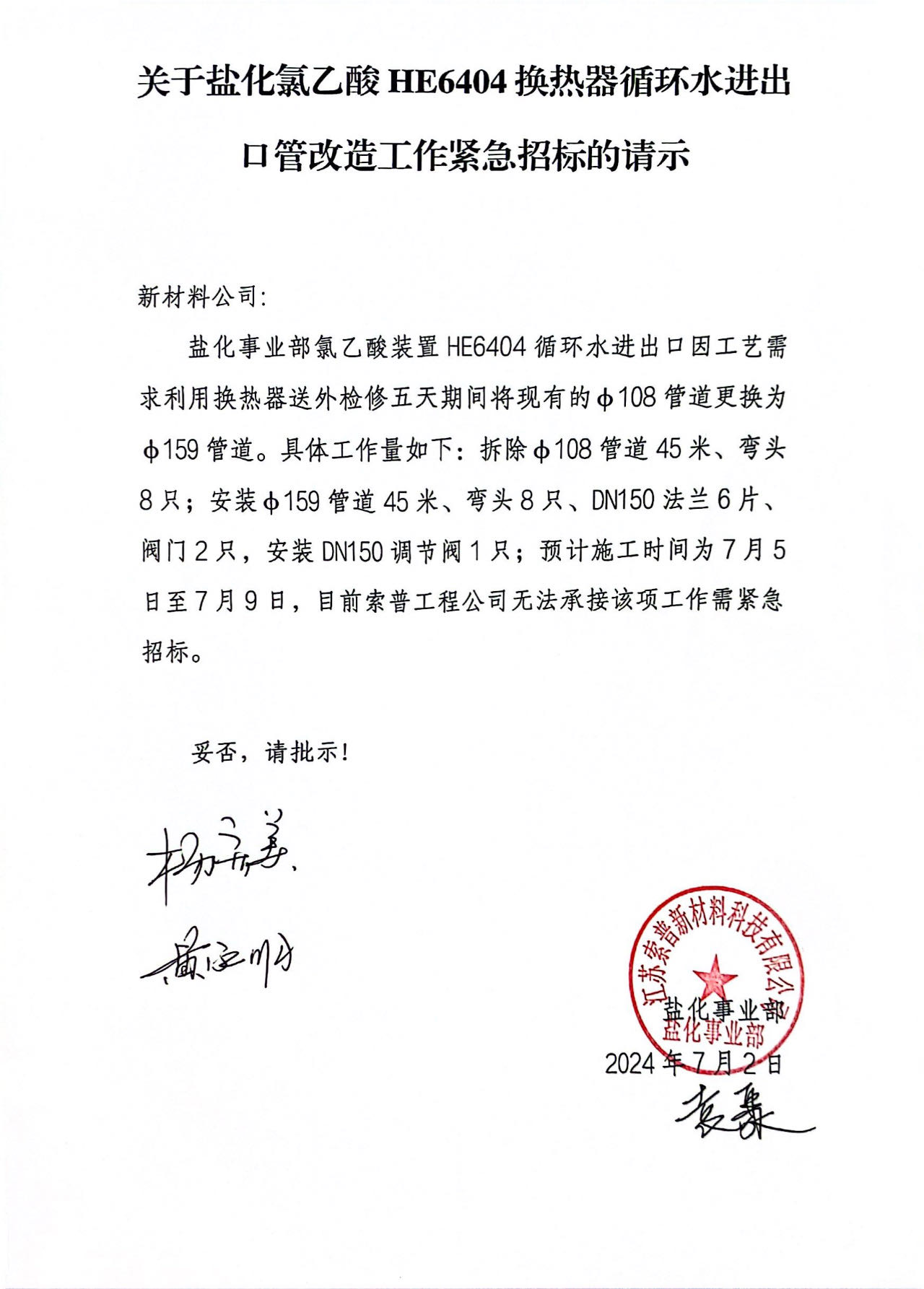 我公司現鹽化氯乙酸HE6404換熱器循環水進出口管改造招標,采用自主招標的方式選定承包商,特邀請貴單位參與投標。